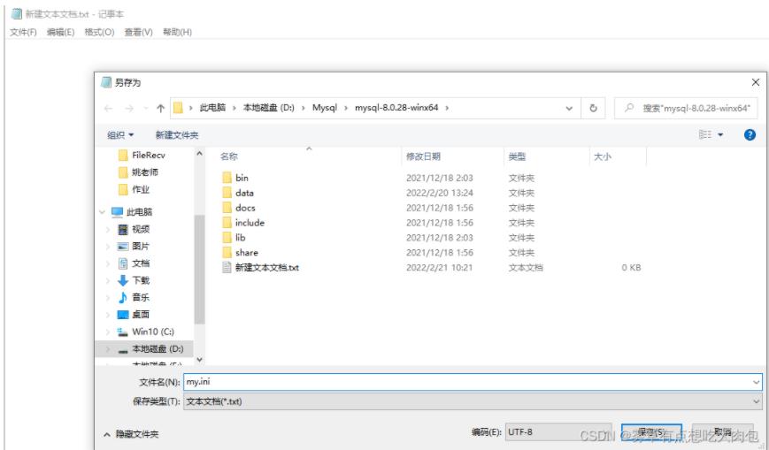 创建my.ini配置文件,因为下面会有控制台创建data文件,所以在这里不要自己创建data文件夹,不要自己创建data文件夹,不要自己创建data文件夹!!!重要的事情说三遍。