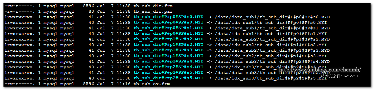 指定路径之后在原来的路径中innodb生成了4个指向数据存储的路径文件,myisam生成了一个th.par文件指明该表是分区表,同时数据文件和索引文件指向了实际的存储路径。