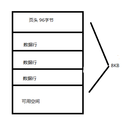 页:用于数据存储的连续的磁盘空间块,SQL Server中数据存储的基本单位是页,磁盘I/O操作在页级执行,页的大小为8KB。每页的开头是96字节的页头,用于存储有关页的系统信息,包括页码、页类型、页的可用空间以及拥有该页的对象的分配单元ID;其他便是存储数据的数据行与剩下可用空间,结构图如下(个人绘制)