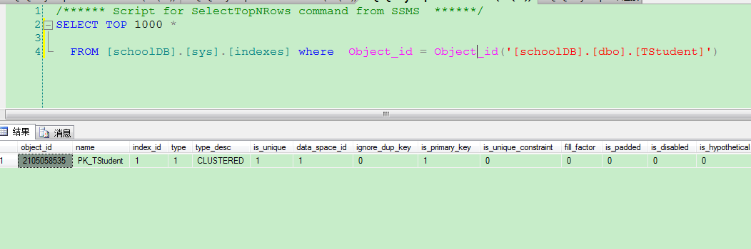 inidex_id = 0 说明表中无索引 inidex_id = 1 表中为聚集索引, inidex_id = 2或者3.。。。。为非聚集索引。