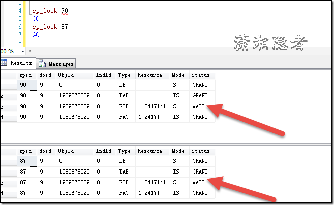 如下所示,你会看到SELECT语句“阻塞”了SELECT语句,即会话90“阻塞”了会话87, 它们的等待事件都为LCK_M_S,也就是说它们都在等待获取共享锁,也许你会置疑这个SQL是否有问题,那么我们使用SP_WHO来查看,你会发现也是如此,如下所示: