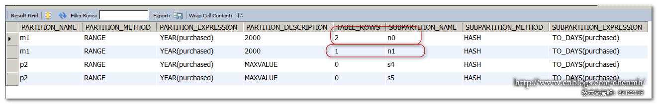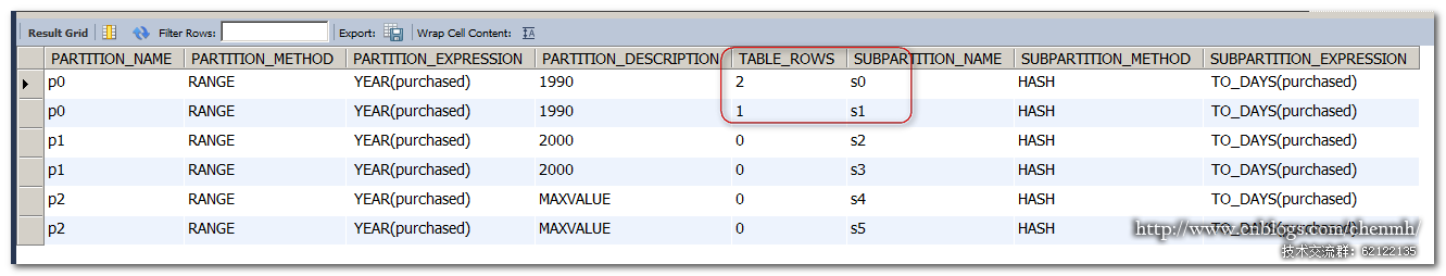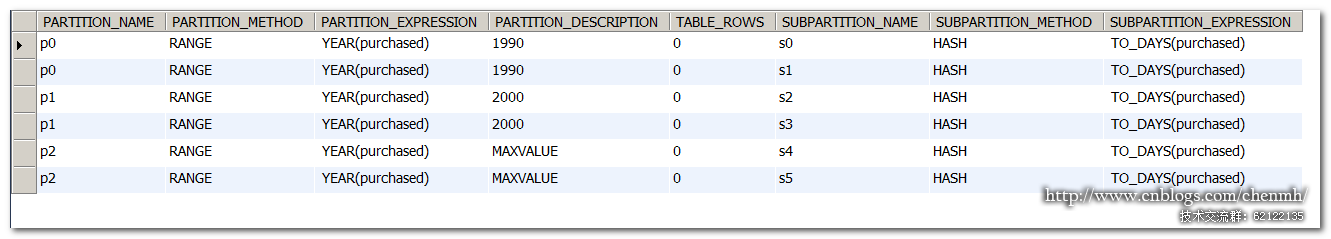 SELECT PARTITION_NAME,PARTITION_METHOD,PARTITION_EXPRESSION,PARTITION_DESCRIPTION,TABLE_ROWS,SUBPARTITION_NAME,SUBPARTITION_METHOD,SUBPARTITION_EXPRESSION