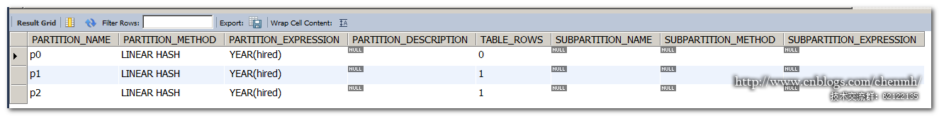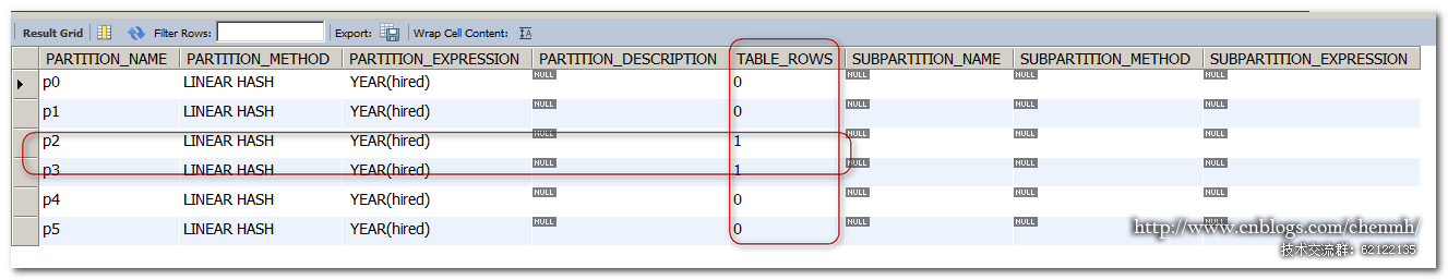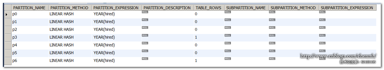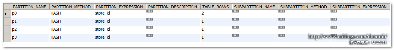 FROM information_schema.PARTITIONS WHERE TABLE_SCHEMA=SCHEMA() AND TABLE_NAME=’tblinhash’;