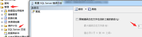 若选中此选项,将限制在错误日志回收前可以创建的错误日志数。 每次启动 SQL Server 实例时都将创建新的错误日志。 SQL Server 将保留前六个日志的备份,除非选中此选项并在下面指定一个不同的最大错误日志文件数。