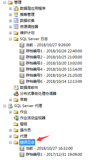 SQL Server 默认情况下,代理创建错误日志来记录警告和错误。 SQL Server 最多可以维护九个 SQL Server 代理错误日志。 每个存档日志都有一个扩展名,指示该日志的相对存在时间。 例如上图,当前表示最新的存档错误日志,而编号1 表示最旧的存档错误日志。