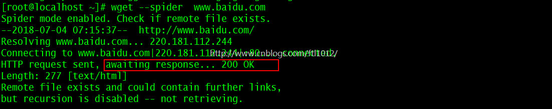[root@localhost ~]# wget –spider www.baidu.com #不下载任何文件