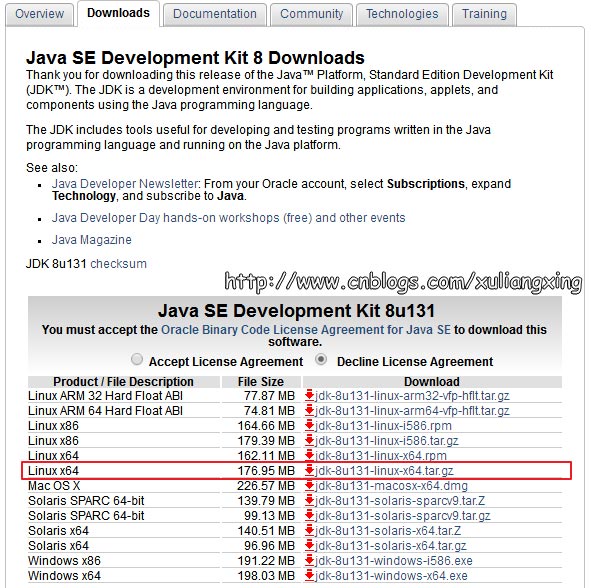 由于我的Linux是64位的,因此我下载jdk-8u131-linux-x64.tar.gz。