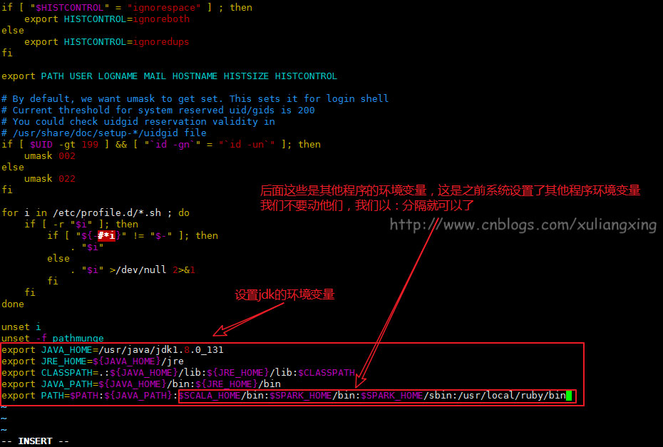 用vim编辑器来编辑profile文件,在文件末尾添加一下内容(按“i”进入编辑):