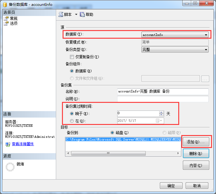 2、在打开的“备份数据库 —accountInfo”对话框中,先点击删除,然后点击“添加”