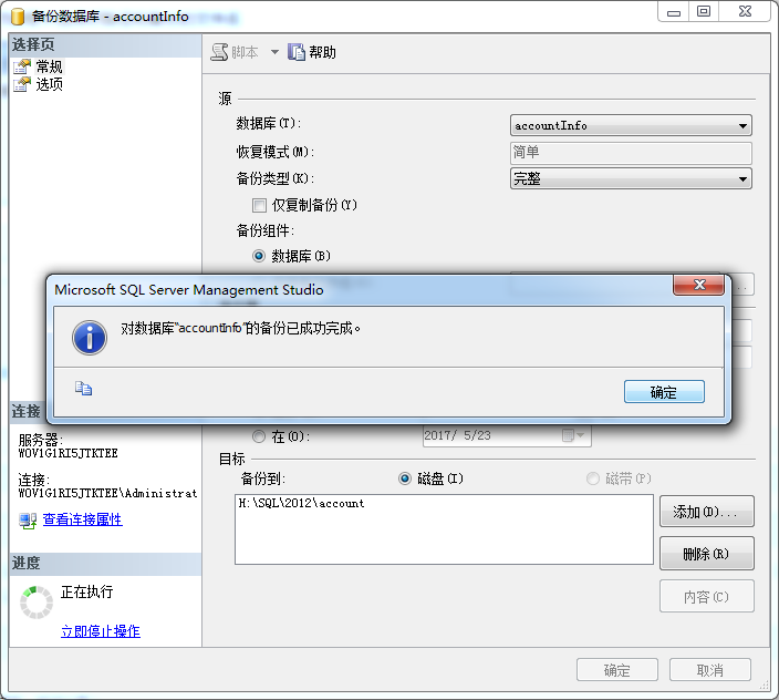 4、之后在备份数据库窗口点击确定,等待备份成功