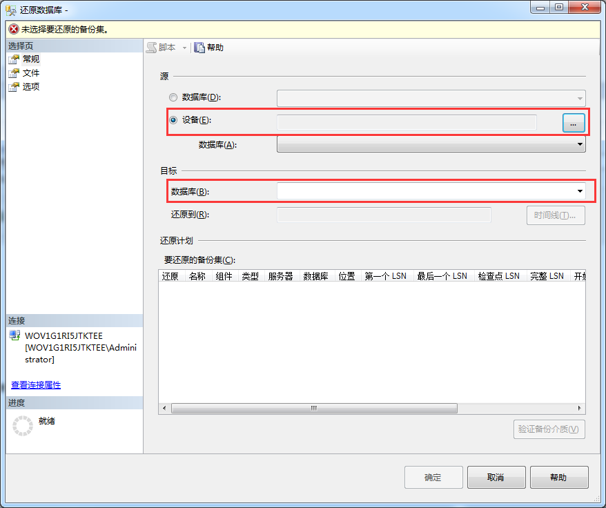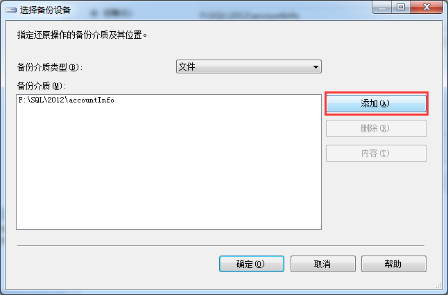 2、在弹出的【还原数据库】窗口,选择【设备】,并点击右侧的【…】;在弹出的【选择备份设备】窗口,点击【添加】,找到备份的文件;在【还原数据库】窗口中【目标-数据库】处输入数据库名称,并单击【确定】。