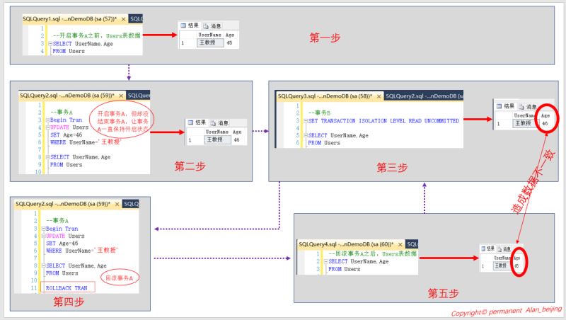 那么也就是说,在这个事务隔离级别,读操作可以与写操作同时进行,互不排斥,读操作可以读取写操作未提交的修改,从而造成数据的不一致性,这种情况,我们称