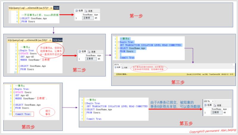 已提交读(READ COMMITTED)指只能读取已提交事务的数据,是防止数据脏读的最低隔离级别,也是SQL Server默认的隔离级别,它要求读操作必须获得共享锁后