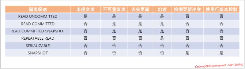 下表总结了每种隔离级别与逻辑一致性问题,检测冲突和行版本控制之间关系
