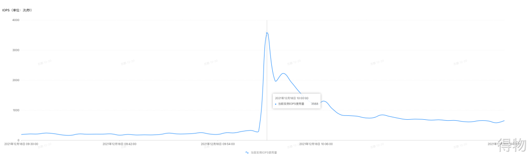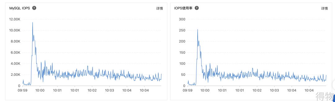 早上 10 点,是活动业务 QPS 最高的时候,因为这时候通常会释放奖品库存。有段时间,监控爆出了慢 SQL 的问题,但是通过监控指标观测 QPS 的时候,并没有到达预想中的峰值,但是读写RT会出现一些突刺。再进而查看 IOPS 指标,我们发现异常得高,如下图: