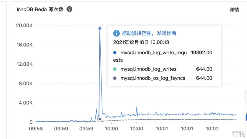 上面的业务背景中数据库 QPS 峰值 1 w,TPS峰值 2.5 k。下面结合这个前提来分析 MySQL 的运行指标。除了上面提到的 IOPS 指标,Buffer pool 请求次数、Redo 写次数等数据指标,这些健康指标协同起来看,会发现该时段真实产生的读、写操作都比较频繁。