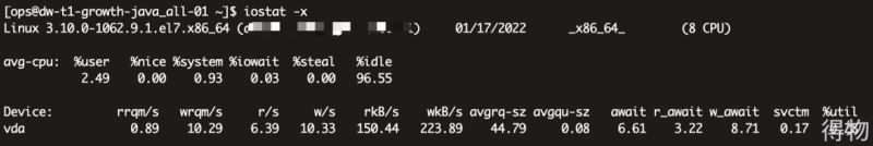 若 %util 接近 100%,说明产生的 I/O 请求太多,I/O 系统已经满负荷,该磁盘可能存在瓶颈;若 svctm 比较接近 await,说明 I/O 几乎不需要等待;若 await 远大于 svctm,说明 I/O 队列太长,I/O 响应太慢,则需要进行必要优化;若 avgqu-sz 比较大,也表示有大量 IO 在等待。