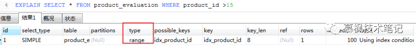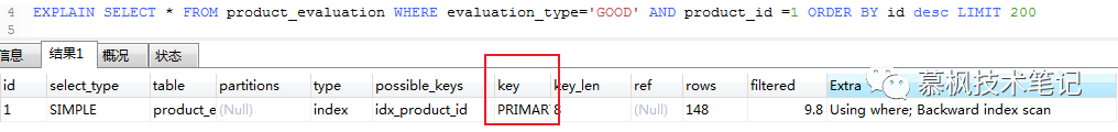 实际上我们在产品评价表product_evaluation中是建立了索引的,正常来说应该是可以使用到对应的索引字段进行查询的。但是实际上查询耗时有几十秒的时间,远远超过我们的预期。那我们猜测是不是由于某种原因导致Mysql优化器没有选择对应的索引进行数据检索,最后造成慢查询的发生。到底执行计划是怎样的,还是得借助于explain来看下。