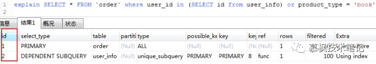 如上图所示,SQL查询语句中,第一个执行计划的id为1,第二个执行计划的id为2,id为1的执行计划对应的table为order,id为2的执行计划对应的table是user_info,结合SQL语句,我们知道先执行子查询select id from user_info,而后再执行关于表order的数据查询。