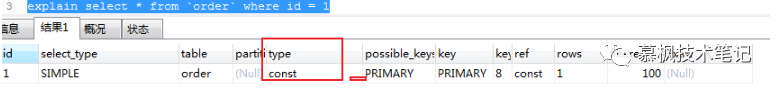 如果type是const,说明在进行数据查询的时候,命中了primary key或唯一索引,此类数据查询速度非常快。