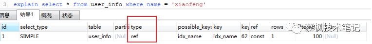 数据查询的时候如果命中的索引是二级索引不是唯一索引,测试查询速度也会很快,但是type是ref。另外如果是多字段的联合索引,那么根据最左匹配原则,从联合索引的最左侧开始连续多个列的字段进行等值比较也是ref的类型。