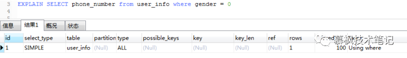 查询时未找到可用的索引,进而通过where条件过滤获取所需数据,但要注意的是并不是所有带where语句的查询都会显示Using where。