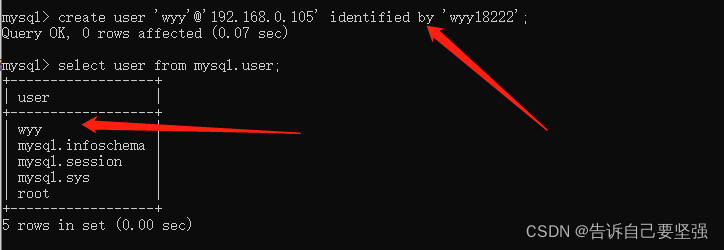 create user ‘wyy’@‘192.168.0.105’ identified by ‘wyy18222’;这个是只能192.168.0.105的链接。
