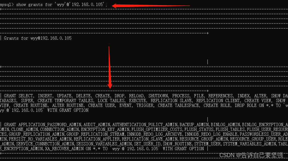 grant all privileges on *.* to ‘wyy’@’192.168.0.105’ with grant option;