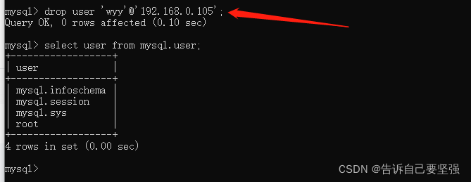 create user ‘wyy’@’192.168.0.105’ identified by ‘wyy18222’;