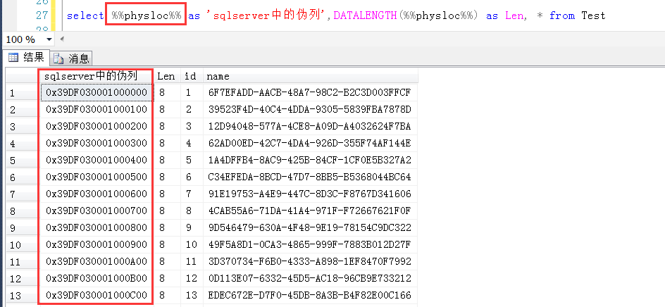 SQL Server中有一个未公开的伪列“%%physloc%%”,也就是在查询的时候,对于任何一张表,可以加上这个字段,比如如下,就可以查到表中每一行的伪列。