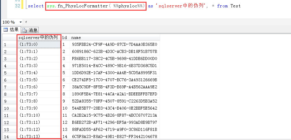 为了更加方便地观察伪列的含义,sqlserver提供了一个未公开的系统函数sys.fn_PhysLocFormatter,下面借助sys.fn_PhysLocFormatter这个函数来继续观察这个伪列
