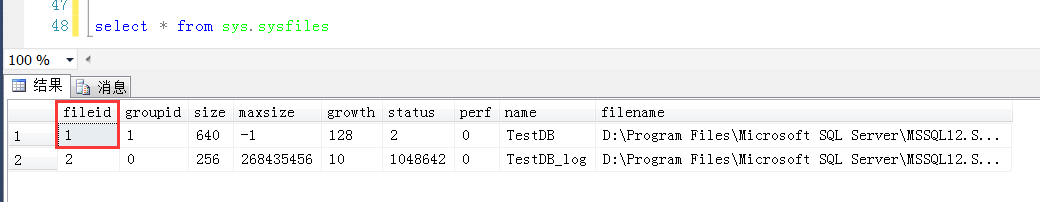 如截图,文件号就是数据库的数据文件编号,这里只有一个数据文件,文件编号为1,建表的时候默认(这里也只能建立)建立在fileid = 1 的文件上面,fileid=2的是日志文件,就不多说了。