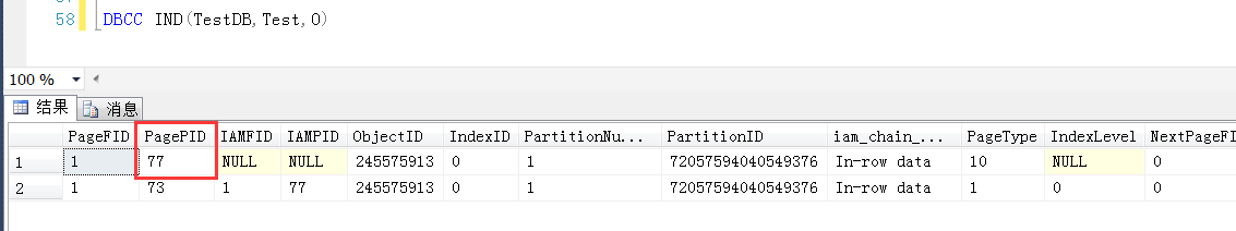 借助DBCC IND命令,查询分配给这个表的页面信息,其中77号页面是IMA也面,至于什么事IMA页面,不多解释。