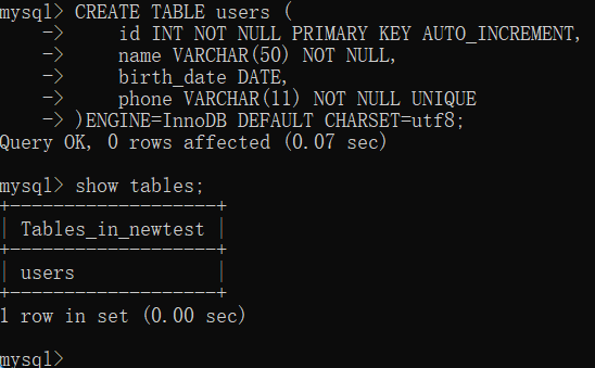 上面的语句创建了一个名为users的表,其中包含5个字段id、name、birth_date和phone。注意,每个字段后面都有一个数据类型声明,表示该字段将存储何种类型的数据,例如:整数、字符串、日期等。