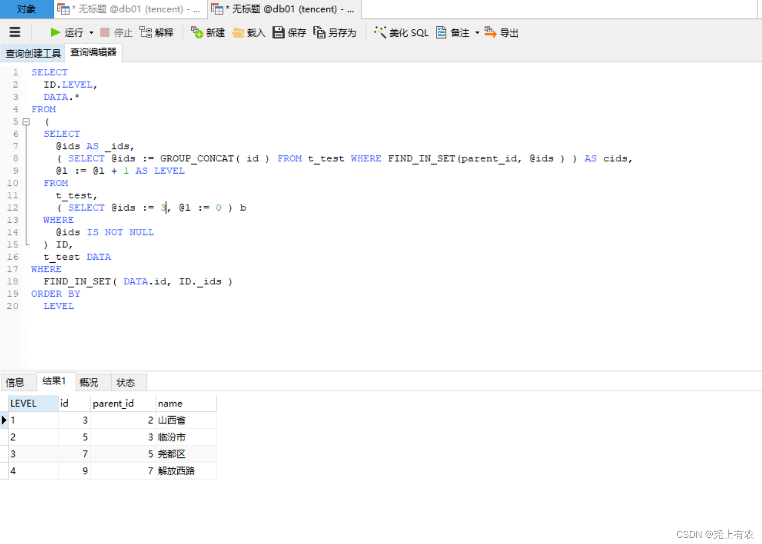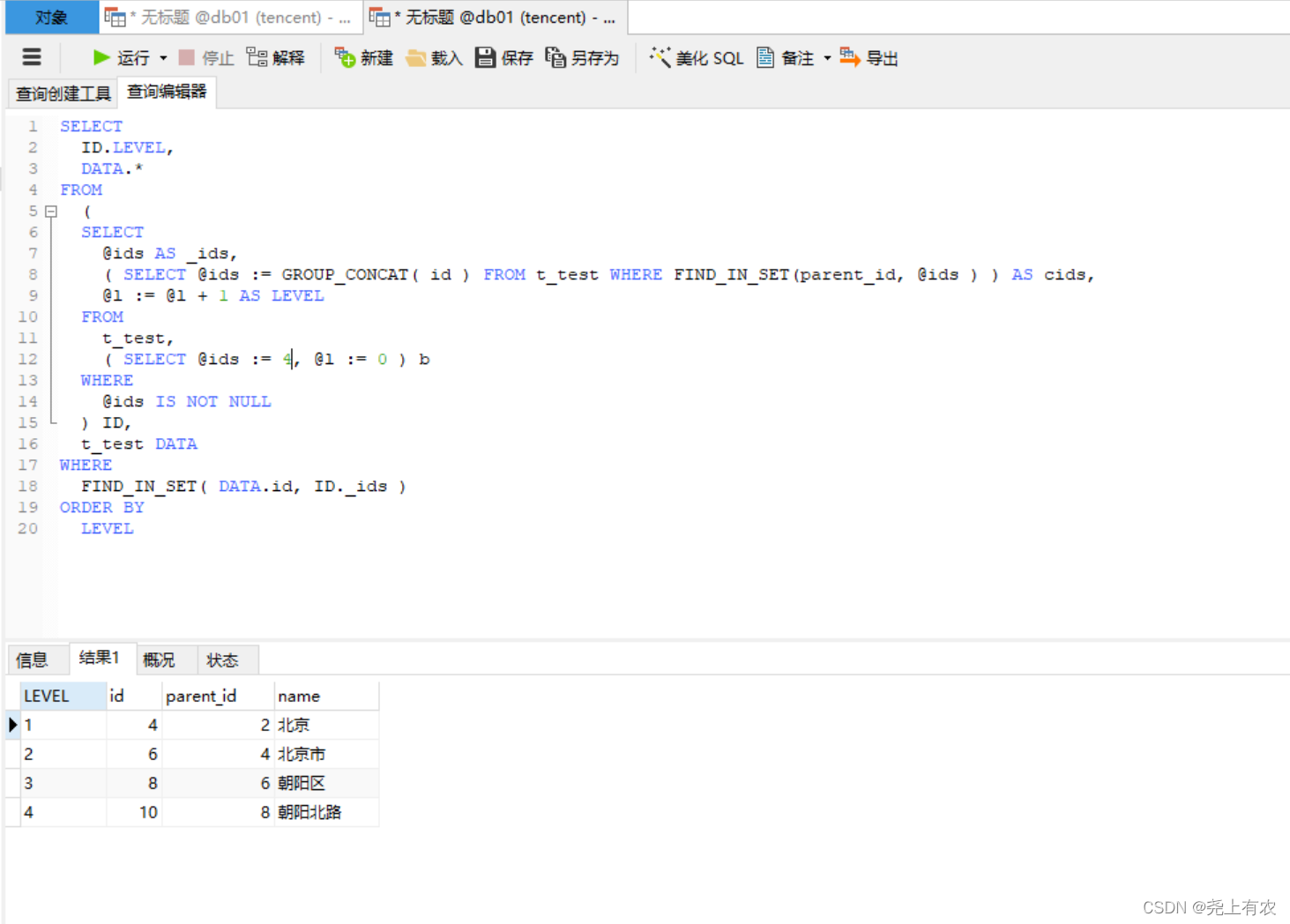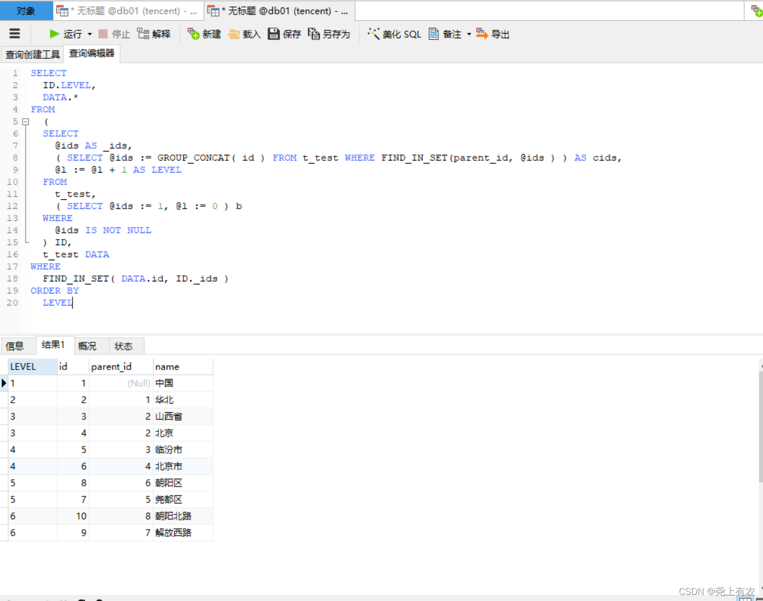 最后再从 id=2 华北地区往下查询