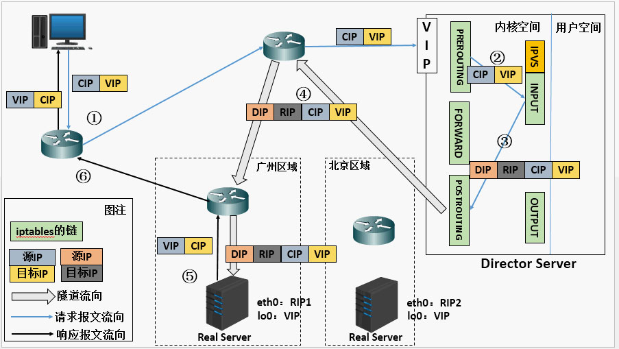 (3)IPVS对比数据包请求的服务是否为集群服务,若是,在请求报文的首部再次封装一层IP报文,封装源IP为DIP,目标IP为RIP。然后发至POSTROUTING链,此时源IP为DIP,目标IP为RIP。