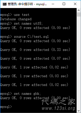 4、在运行 source 命令后如果需要在命令行正确查看中文,先执行命令:set names gbk;修改命令行窗口字符编码。如下: