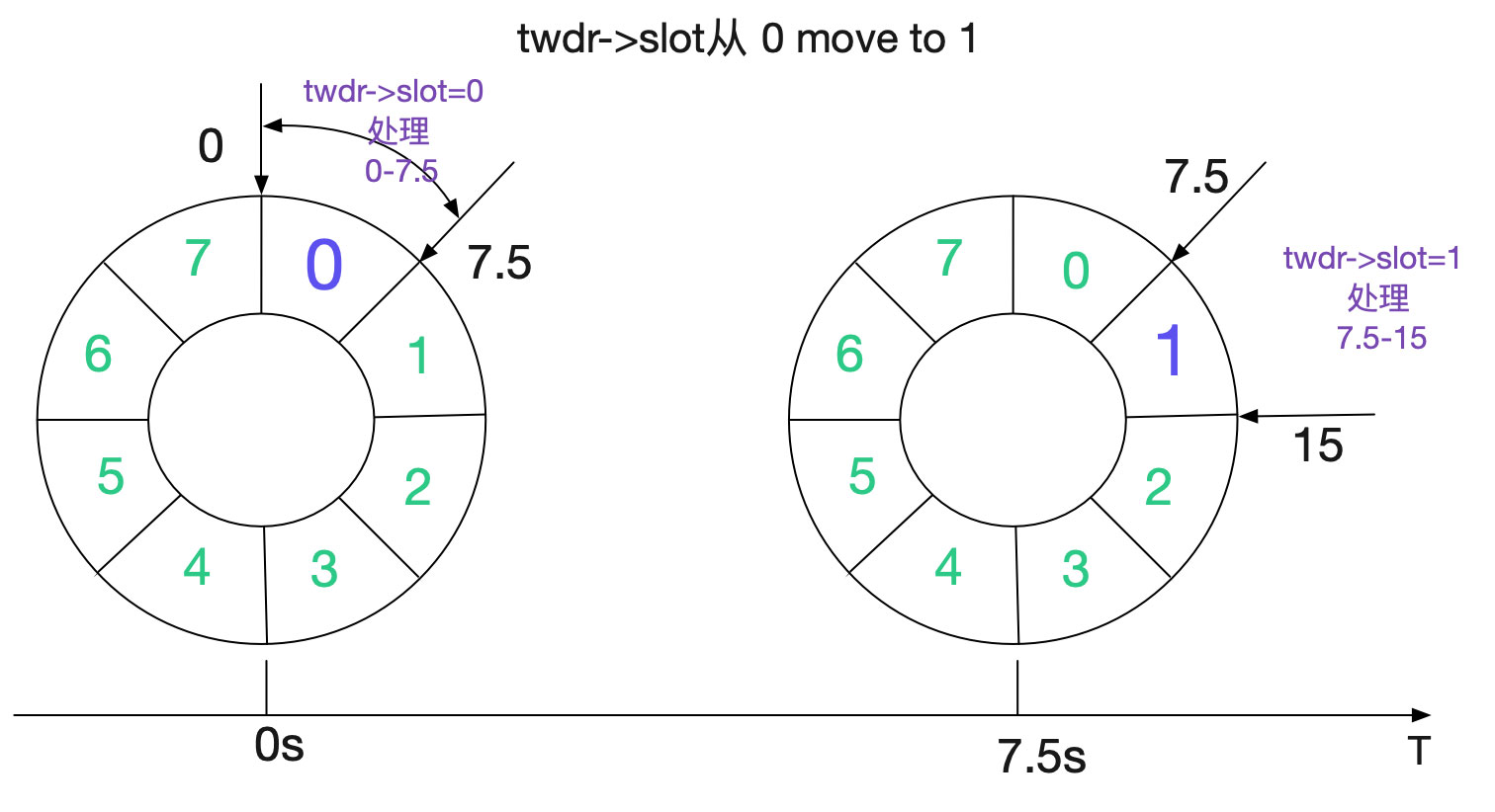 内核将60s的时间分为8个slot(INET_TWDR_RECYCLE_SLOTS),每个slot处理7.5(60/8)范围time_wait状态的socket。