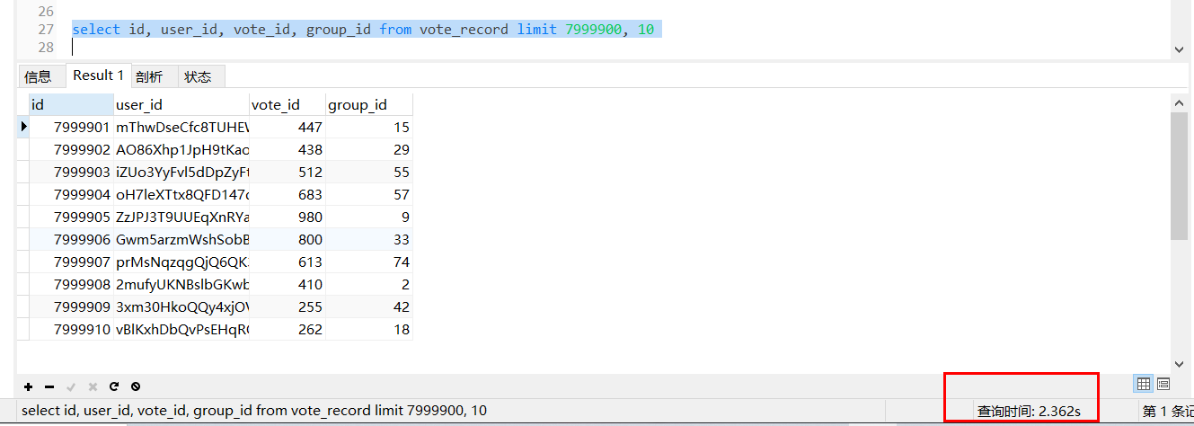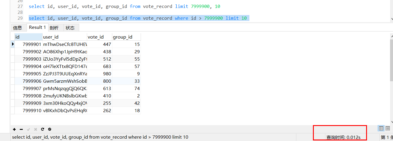 因为利用索引查找有优化算法,且数据就在查询索引上面,不用再去找相关的数据地址了,这样节省了很多时间。上述vote_record 表的id字段是主键,自然就包含了默认的主键索引,这样,mysql会走主键索引,直接连接到7999900处,然后查出来10条数据。但是这个方式需要接口的调用方配合改造,把上次查询出来的最大id以参数的方式传给接口提供方,会有一定沟通成本。