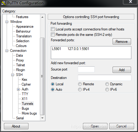 在source port 中输入5901,destination输入 127.0.0.1:5901,然后点击Add按钮,即可添加入上图所示的效果。