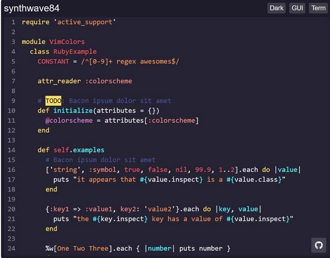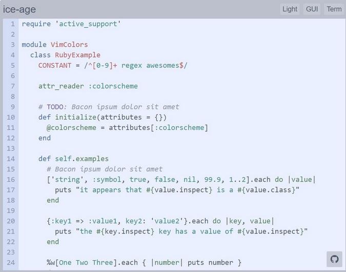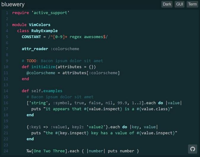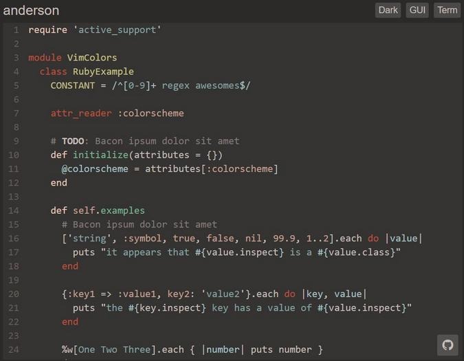 如果不喜欢默认主题呢?我们可以到在 Github上找到很多不错的主题,而其中很多也可以通过 Vimcolors.com 来获取。其中有些主题不仅改变代码和语法的颜色,还会改变背景颜色。