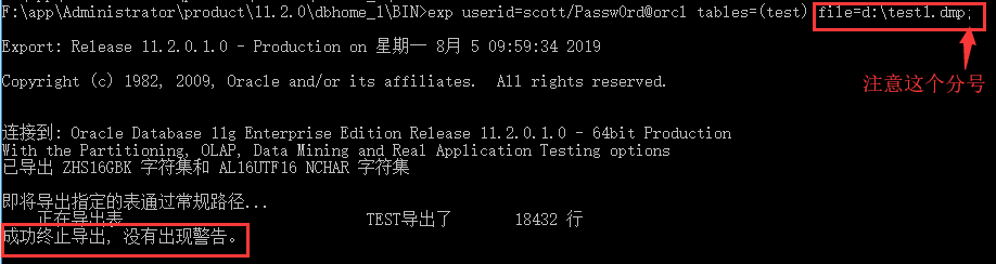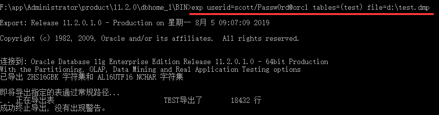 例: exp userid=scott/test@orcl tables=(test) file=d:\test.dmp
