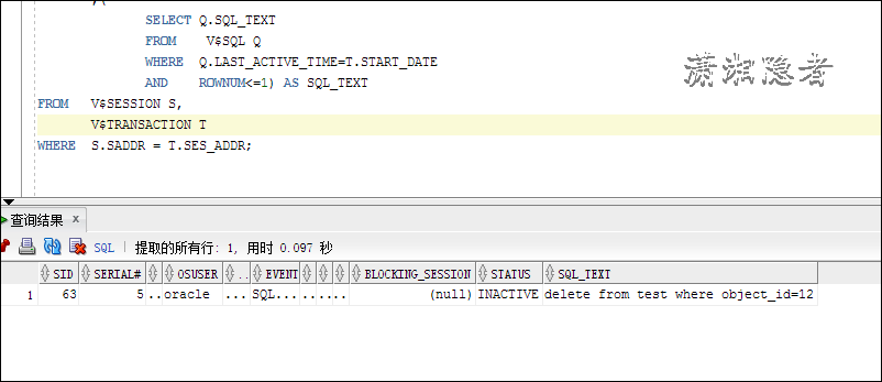 然后我们在会话2(SID=70)中,我们使用下面SQL查询未提交的SQL语句。如下所示: