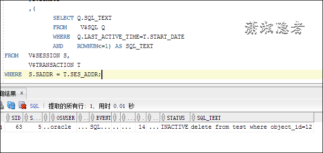 在Oracle数据库中,我们能否找到未提交事务(uncommit transactin)的SQL语句或其他相关信息呢? 关于这个问题,我们先来看看实验测试吧。实践出真知。
