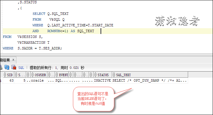 如上所示,这个SQL我们会查出很多不相关的SQL语句,接下来我们可以用下面的SQL查询(改用SQL Developer展示,因为SQL*Plus,不方便展示),如下所示,这个SQL倒不会查出不相关的SQL。但是这个SQL能胜任任何场景吗? 答案是否定的。