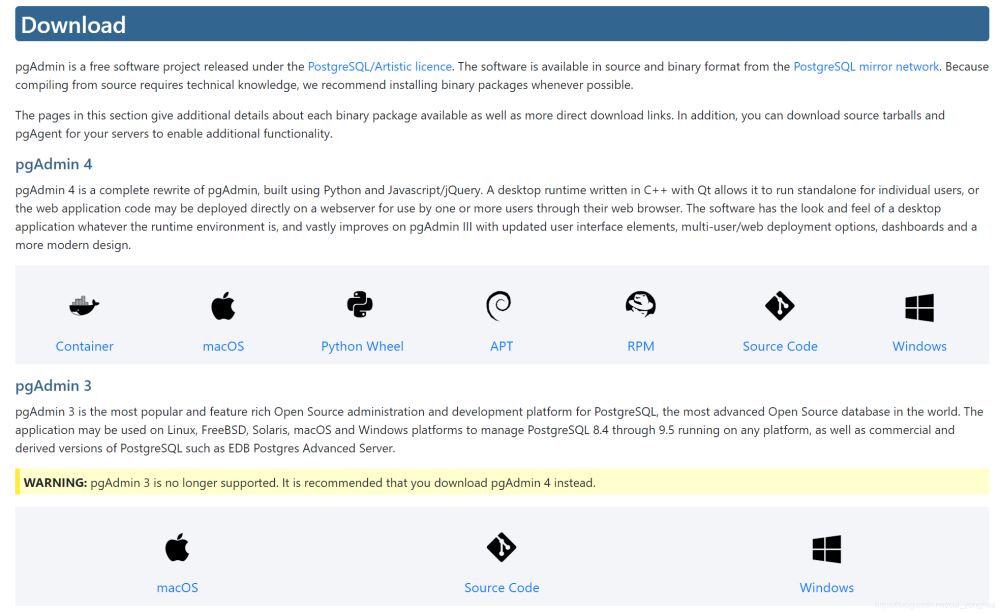 在官网中可以看到,pgAdmin3不再支持,推荐使用pgAdmin4,下面将详细介绍pgAdmin4的详细用法。