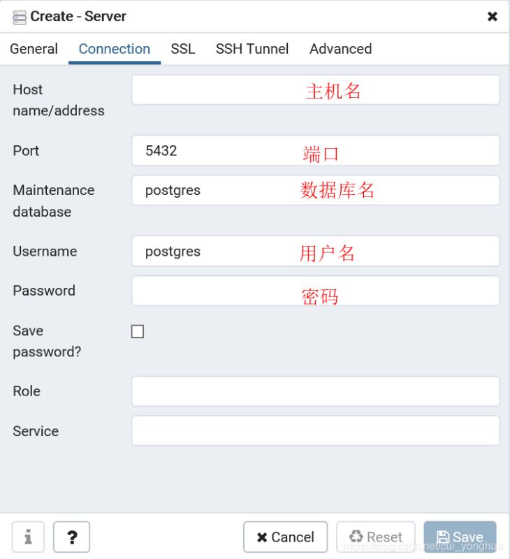 在General中写完连接名之后,然后在Connection中依此填写主机名,端口,数据库名,用户名,密码等信息,即可连接。