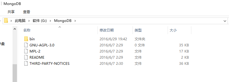 下载完msi文件之后安装,在安装的时候需要注意下安装的路径,我把它安装在了G:\MongoDB的文件夹中。安装完成后MongoDB文件夹会出现下面的几个文件