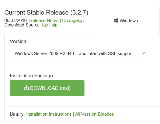 在这个网址中选择要下载的开发环境https://www.mongodb.com/download-center,然后下载下来。我选择的是64位支持ssl的3.2.7版本。