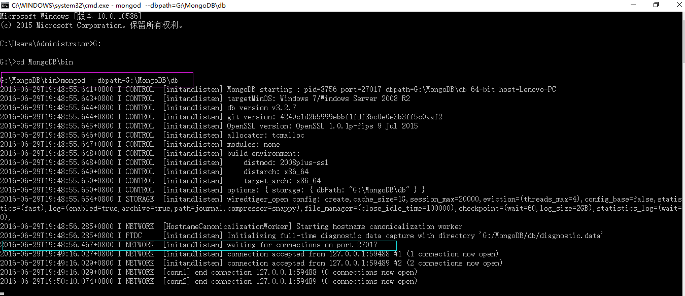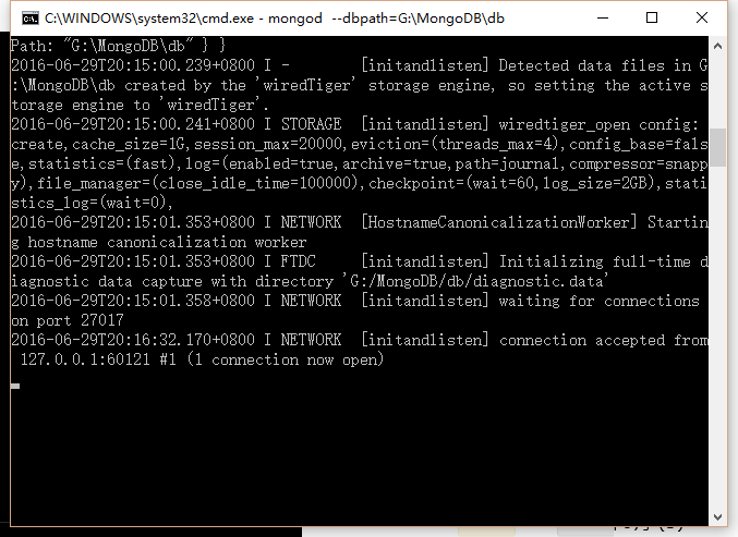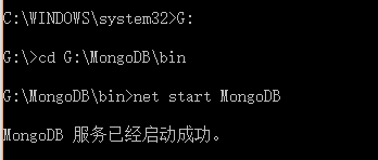 通过命令行窗口,指向G:\MongoDB\bin文件,然后通过mongod --dbpath=G:\MongoDB\db设置数据存放的位置